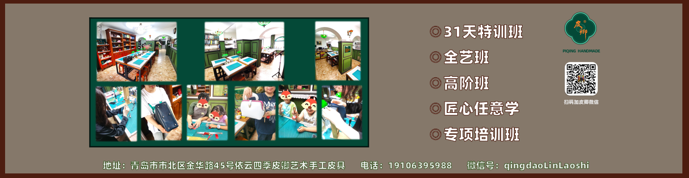 皮卿艺术手工皮具培训坐落于美丽的海滨城市青岛,是系统专业培训手工皮具的理想选择!拥有固定专业线下实体,优雅的环境与系统专业的皮具制作培训,全方位提升学员的获得感!皮卿师傅为资深手工皮具匠人,拥有植鞣皮具制作、铬鞣皮具制作、稀有皮料制作、皮雕塑、皮彩绘、版型打板出格、针车等各种辅助器材熟练运用的专业技能。皮卿手工皮具拥有系统化的教程、课程表、知识体系、学习目录,让学员明确能学到什么。适合全国零基础学员报名,从小白到精通,皮卿手工皮具培养资深手工皮具制作匠人!