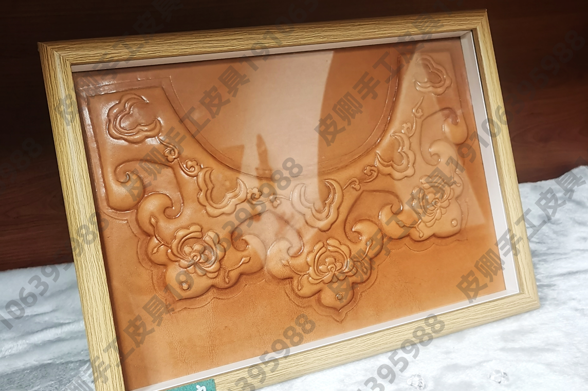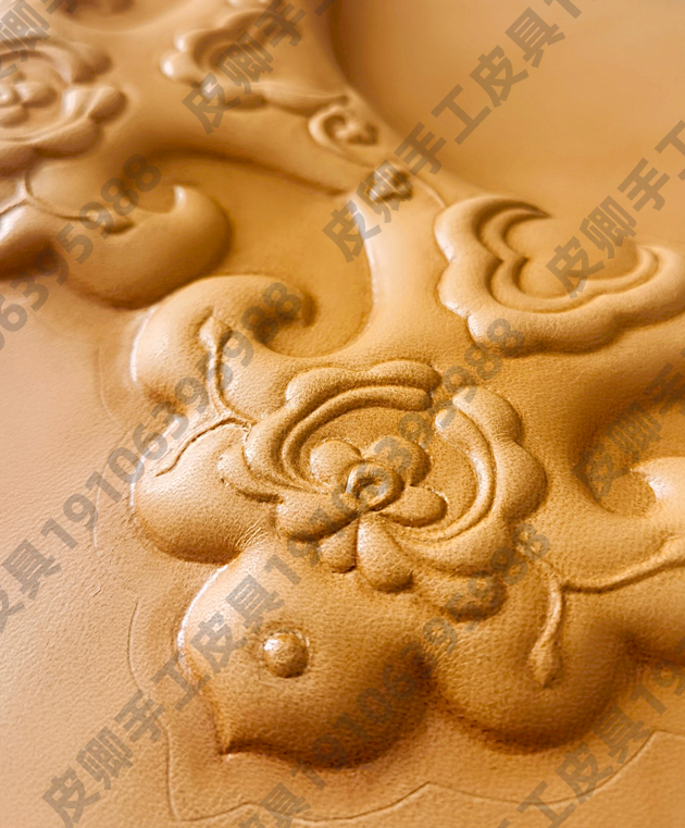 皮卿手工皮具培训皮雕塑作品《云肩》1有个到店的顾客,看到我这个做完的作品就说,我知道这个肯定是用那个模具一压就出来的,我说这个是我用手一点一点扣出来的,我一年要做一百款不同的样式,难道要做一百套模具?一套定制的纯铜模具你知道要多少钱吗?如果就一件作品值得做模具吗?重要的是模具压印大多只能做出一层浮雕的效果,做不出来多层立体浮雕的,比如我这个皮料上面有云肩的造型突起,云肩上有牡丹花瓣和蝙蝠的凸起,花瓣和蝙蝠上还有高低层次,也就是三层浮雕结构,模具是做不出这么复杂的层次结构的。另外,有些高难度的手工皮雕塑更存在不限于垂直层次上的雕刻。所以说,隔行如隔山,我们手工皮具培训更有用的不是模具,而是这双手!