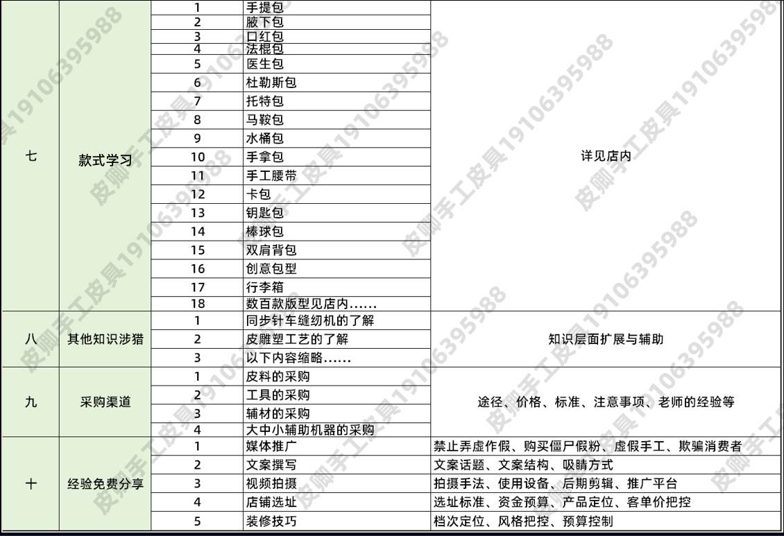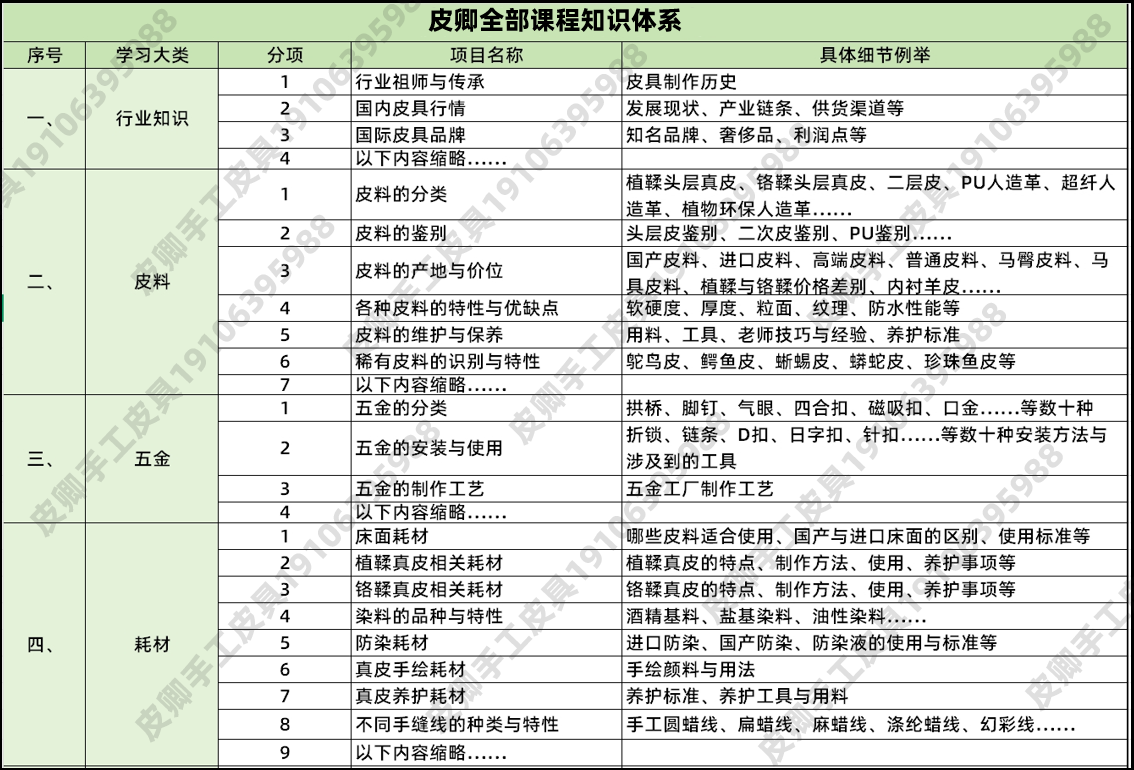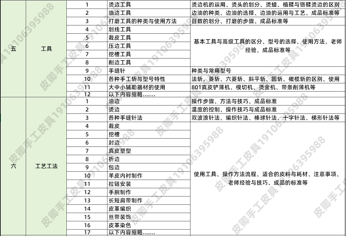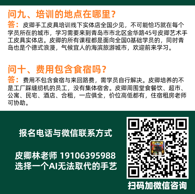 4、手工皮具培训学员具体能学到什么?请向皮卿林老师索取《学习制作清单》,皮卿手工皮具培训电话:19106395988,微信号搜索:qingdaoLinLaoshi