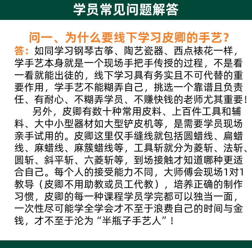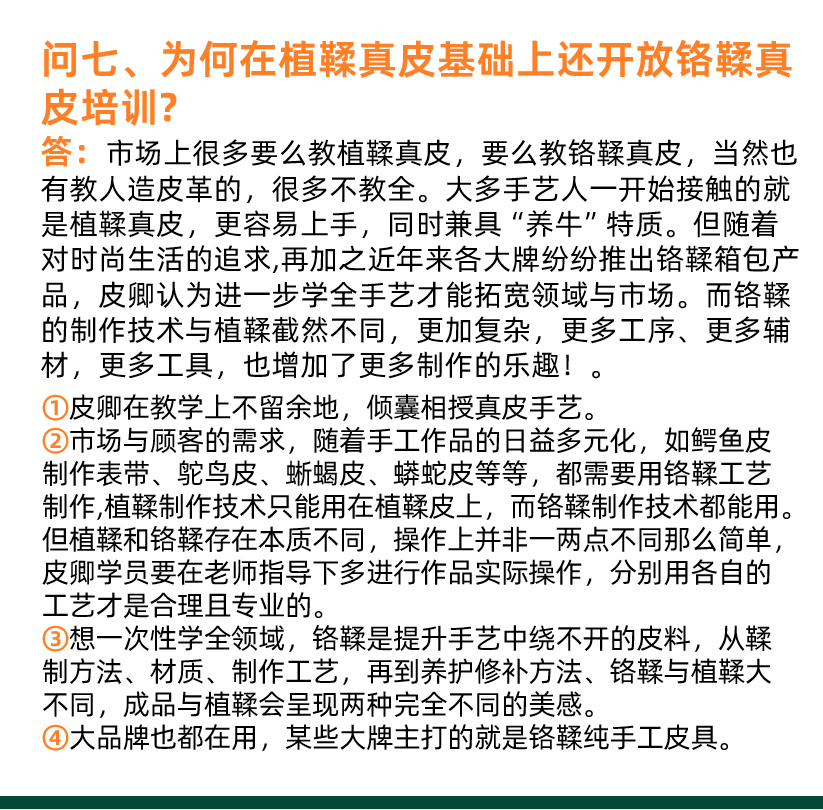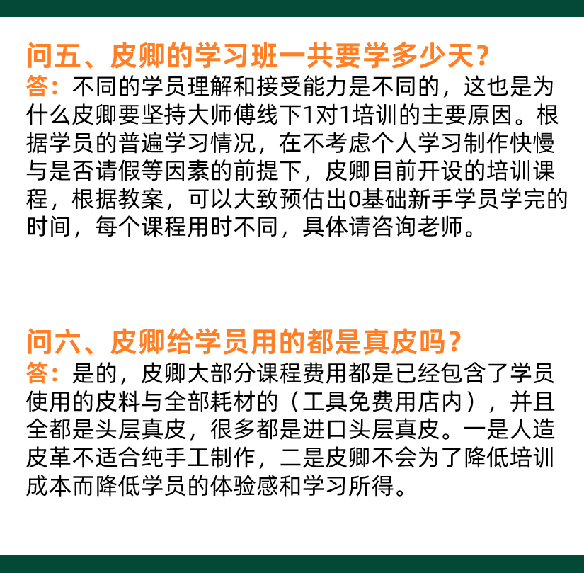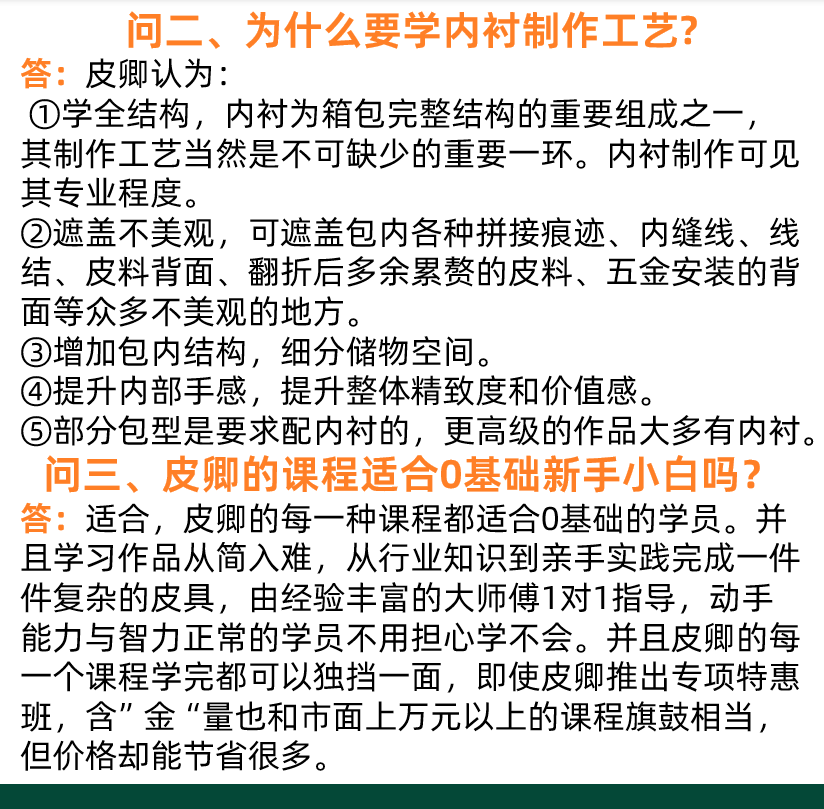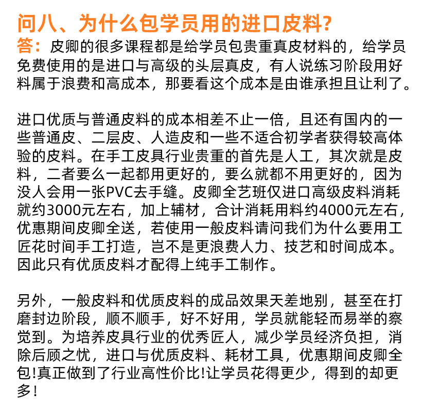1、这个课程的费用包含了学习所需的全部进口与品质皮料、耗材、工具(合计约4000元赠送),不含食宿与往来路费,店内大型器材等可免费使用,其他费用问题请咨询老师,对比30天速成班不必学员自费购买材料即可使用店内高端皮料工具等,且3个月的学习深度、广度、丰富度、老师的经验的传授程度自然比速成班要高出太多,想要成为优秀皮具匠人的学员建议选择全艺班;